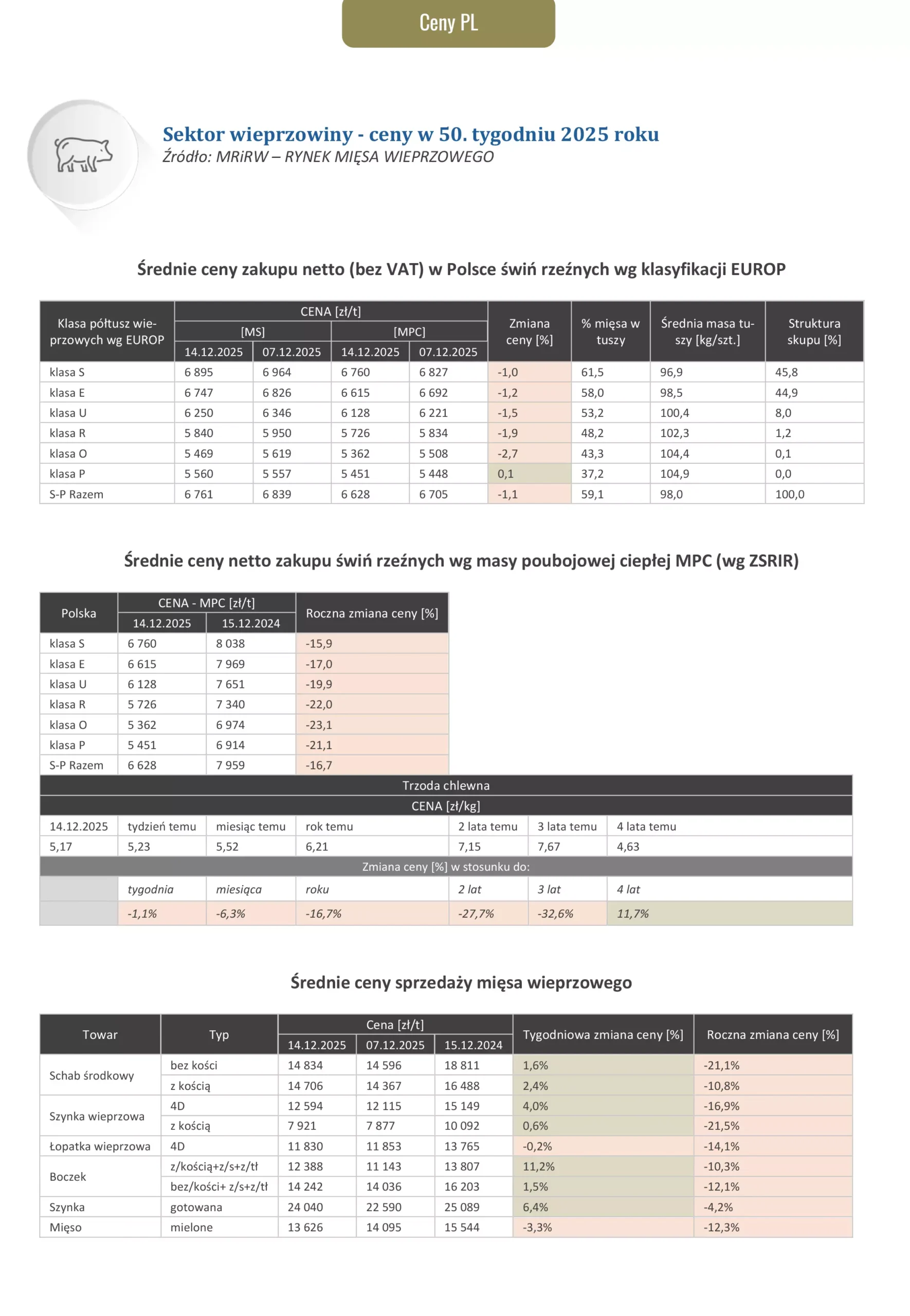 Ceny dotyczące wieprzowiny za okres 08.12.2025 – 14.12.2025