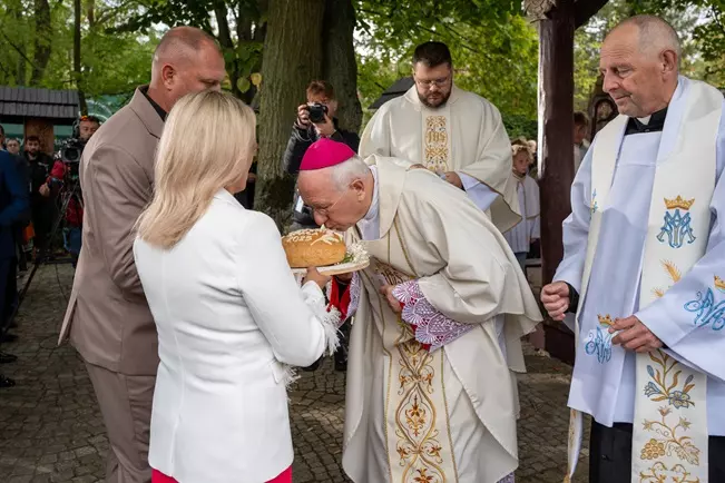 Podczas mszy polowej, odprawionej przez bpa Andrzeja Dziubę, starostowie dożynek przekazali przedstawicielom władz bochen chleba wypieczony z tegorocznego ziarna.