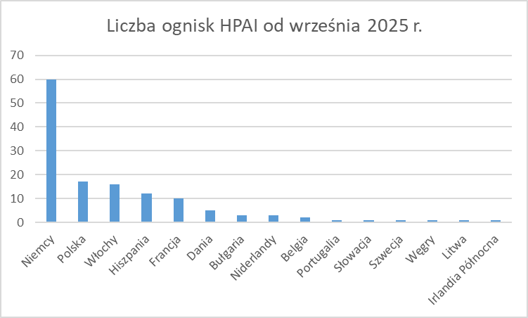 Od września do 7 listopada 2025 r. potwierdzono w UE 134 nowe ogniska HPAI, najwięcej w Niemczech, Polsce, Włoszech i Hiszpanii. W Polsce liczba ognisk u drobiu hodowlanego na początku listopada przekroczyła 100.