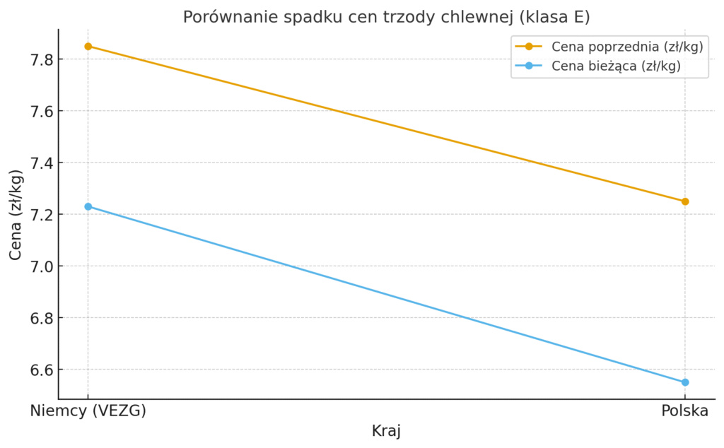 Wykres przedstawia spadek cen trzody chlewnej w klasie E w Polsce i Niemczech. Widać wyraźnie, że Polska odnotowała głębszy spadek (ok. –9,6%) niż Niemcy (ok. –7,9%), co dobrze ilustruje nerwową reakcję krajowego rynku.