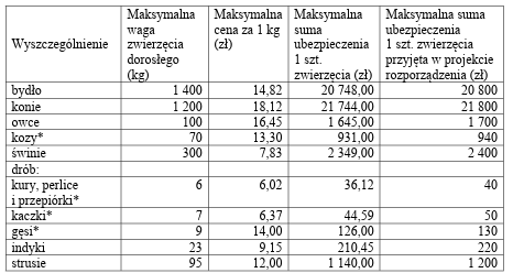 W projekcie rozporządzenia przyjęto, że maksymalne sumy ubezpieczenia dla poszczególnych upraw i gatunków zwierząt zostały obliczone na podstawie: