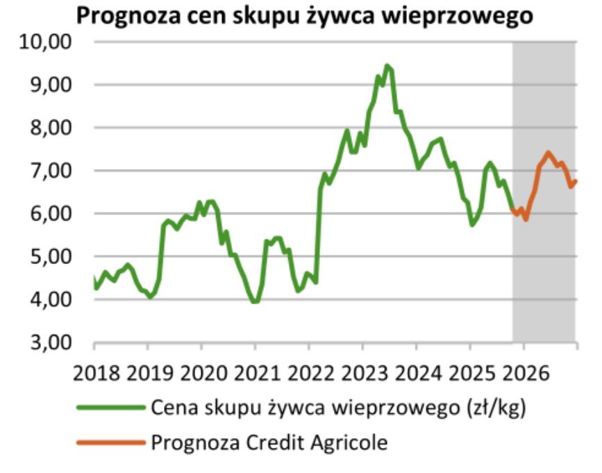 Zgodnie z analizą ekonomistów Credit Agricole przedstawioną w „Kwartalniku Agrobiznesu – Zima 2025”, polska gospodarka weszła w fazę trwałego ożywienia, które w kolejnych kwartałach będzie sprzyjać również sektorowi rolno-spożywczemu, w tym branży mięsnej. Wzrost PKB w 2026 r. ma utrzymać się na poziomie 3,6%, przy stabilnym popycie krajowym, niższej inflacji oraz wyraźnym ożywieniu inwestycji. Prognozowane obniżenie średniorocznej inflacji CPI do 2,7% w 2026 r. oraz zakończenie cyklu łagodzenia polityki pieniężnej przy stopie referencyjnej NBP na poziomie 3,75% poprawiają warunki finansowania produkcji zwierzęcej. Podczas konferencji prasowej prezes NBP Adam Glapiński wskazał, że obecny poziom stóp jest (w jego ocenie) „doskonały”, a ewentualne dalsze obniżki zależeć będą od stanowiska pozostałych członków RPP. Rynek odbiera to jako sygnał stabilizacji kosztu pieniądza, istotnej z punktu widzenia producentów żywca i przetwórców mięsa.