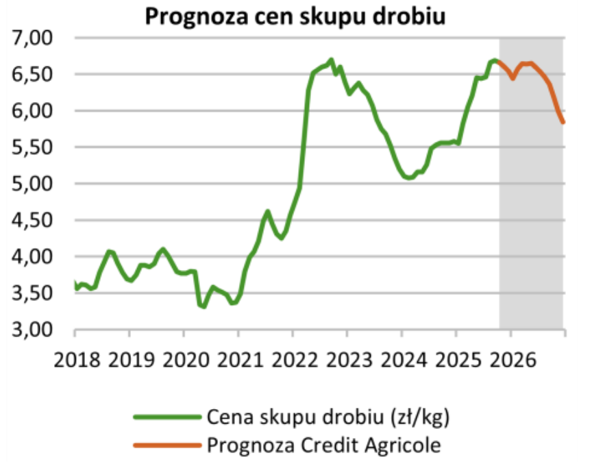 Sytuacja na rynku drobiu w Polsce pozostaje pod silnym wpływem strat związanych z grypą ptaków (HPAI) oraz rzekomym pomorem drobiu (ND). Credit Agricole szacuje, że wylęgi kurcząt brojlerów są obecnie o ok. 6% niższe niż w scenariuszu bez występowania chorób. Przy wiodącej roli Polski na unijnym rynku mięsa drobiowego oraz tempie wzrostu spożycia przewyższającym tempo wzrostu podaży, czynniki te sprzyjają utrzymywaniu się wysokich cen skupu.