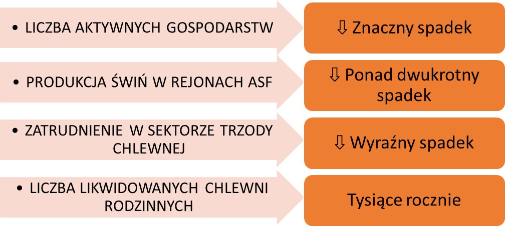 Tempo spadku produkcji w regionach objętych ASF było ponad dwukrotnie wyższe niż w obszarach wolnych od choroby. W efekcie wiele obszarów wiejskich utraciło potencjał rozwojowy i gospodarczy.