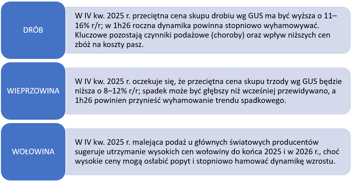 Prognozy na IV kw. 2025 są zróżnicowane: wyższe ceny drobiu (11–16% r/r), spadek cen trzody (–8–12% r/r) i utrzymanie wysokich notowań wołowiny. Dla producentów i handlu kluczowe pozostaną: monitoring zdrowotności stad, zarządzanie ryzykiem handlowym oraz reagowanie na zmiany w popycie międzynarodowym.