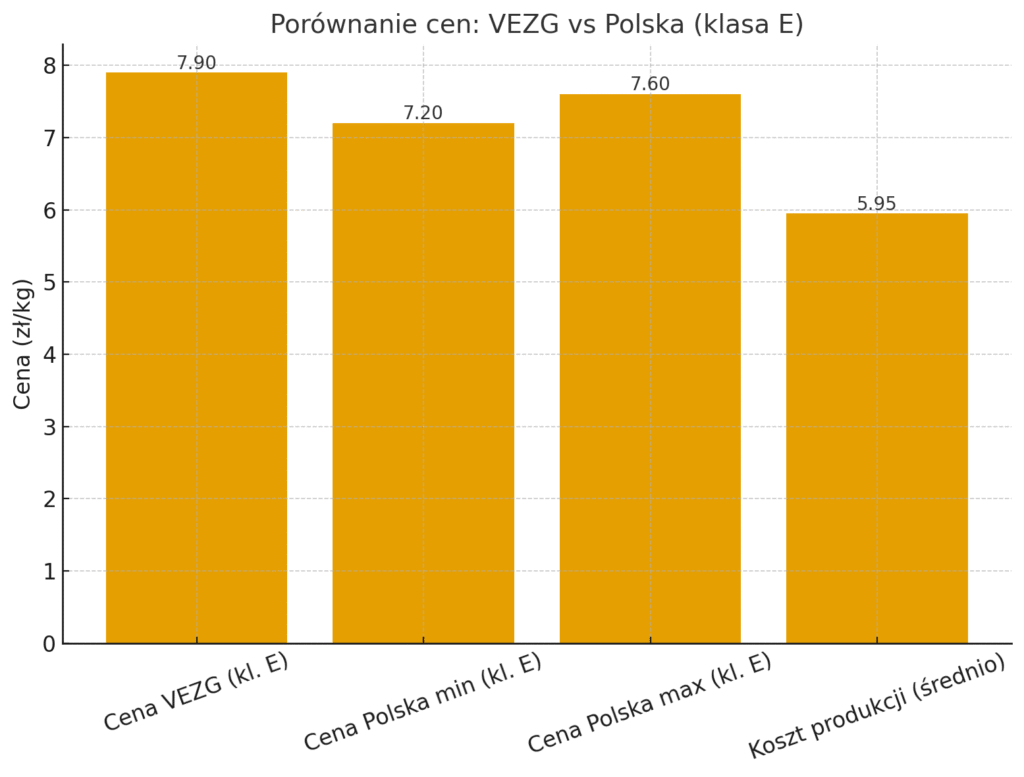 Wykres porównujący ceny VEZG z sytuacją na rynku polskim, na którym widać wyraźnie, że krajowe stawki pozostają poniżej poziomu niemieckiego, a jednocześnie niewiele przewyższają realne koszty produkcji.