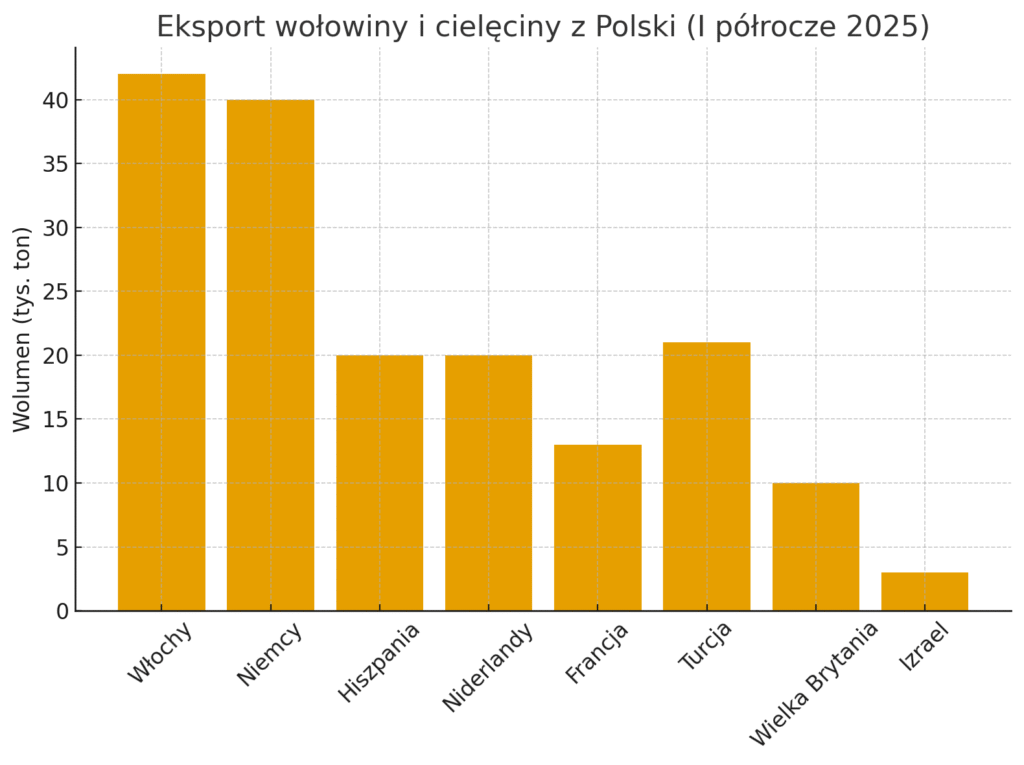W pierwszym półroczu 2025 r. z Polski wyeksportowano 280 tys. ton produktów wołowych i cielęcych (ekwiwalent tusz), o 4% więcej niż przed rokiem. Wartość eksportu wyniosła ponad 1,7 mld euro (7,4 mld zł), co oznacza wzrost o 32% r/r.