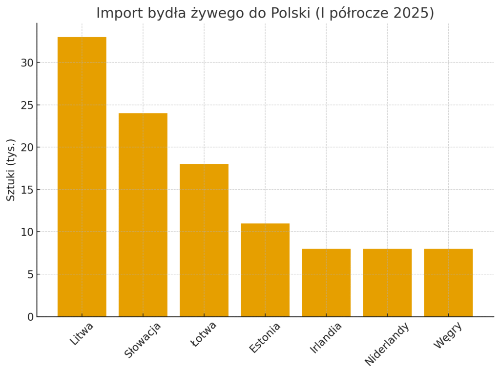 W zakresie żywca sprowadzono 136 tys. sztuk bydła, w tym 81 tys. cieląt (60%). Najwięksi dostawcy to: Litwa (33 tys. szt.), Słowacja (24 tys.), Łotwa (18 tys.), Estonia (11 tys.), a także Irlandia, Niderlandy i Węgry (po ok. 8 tys. szt.).